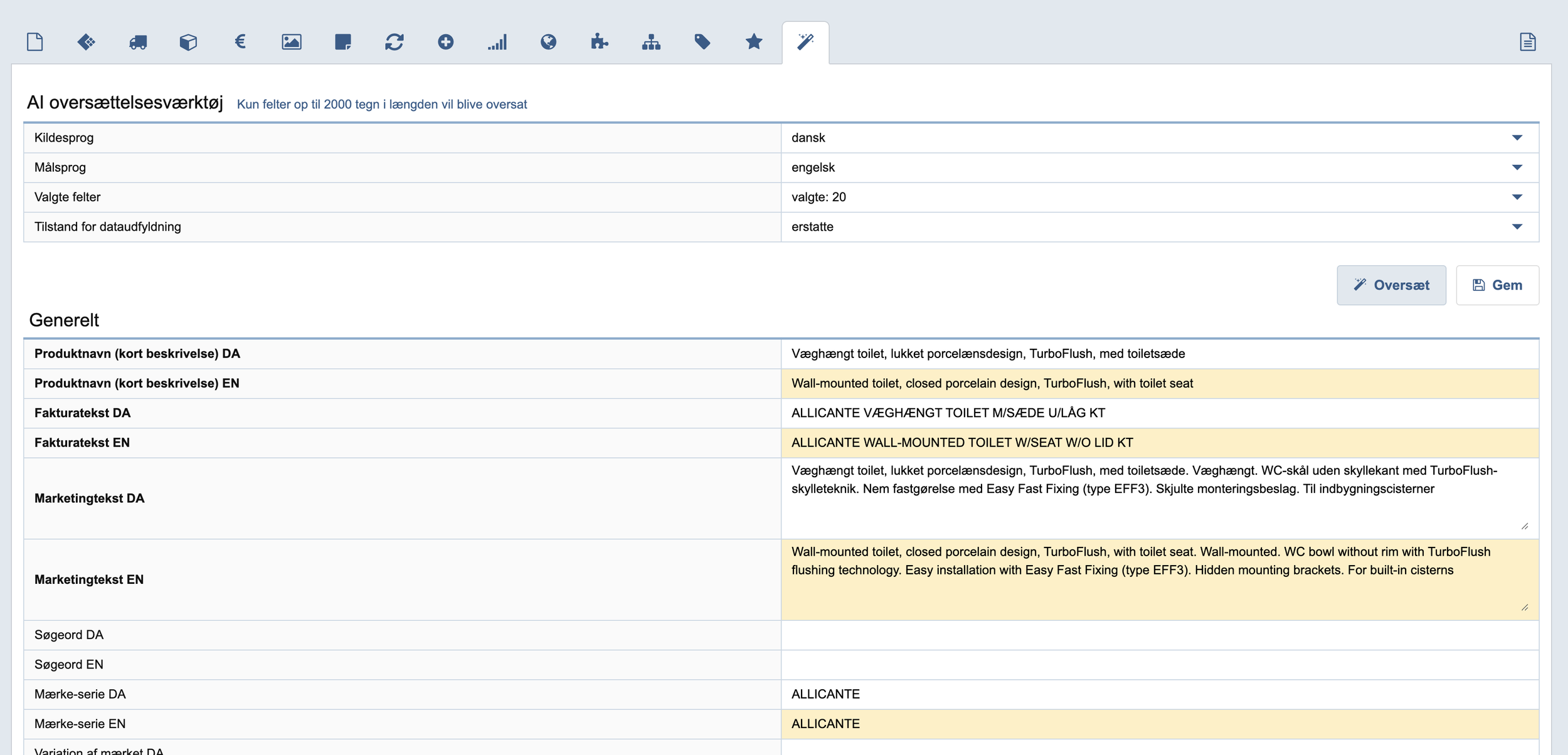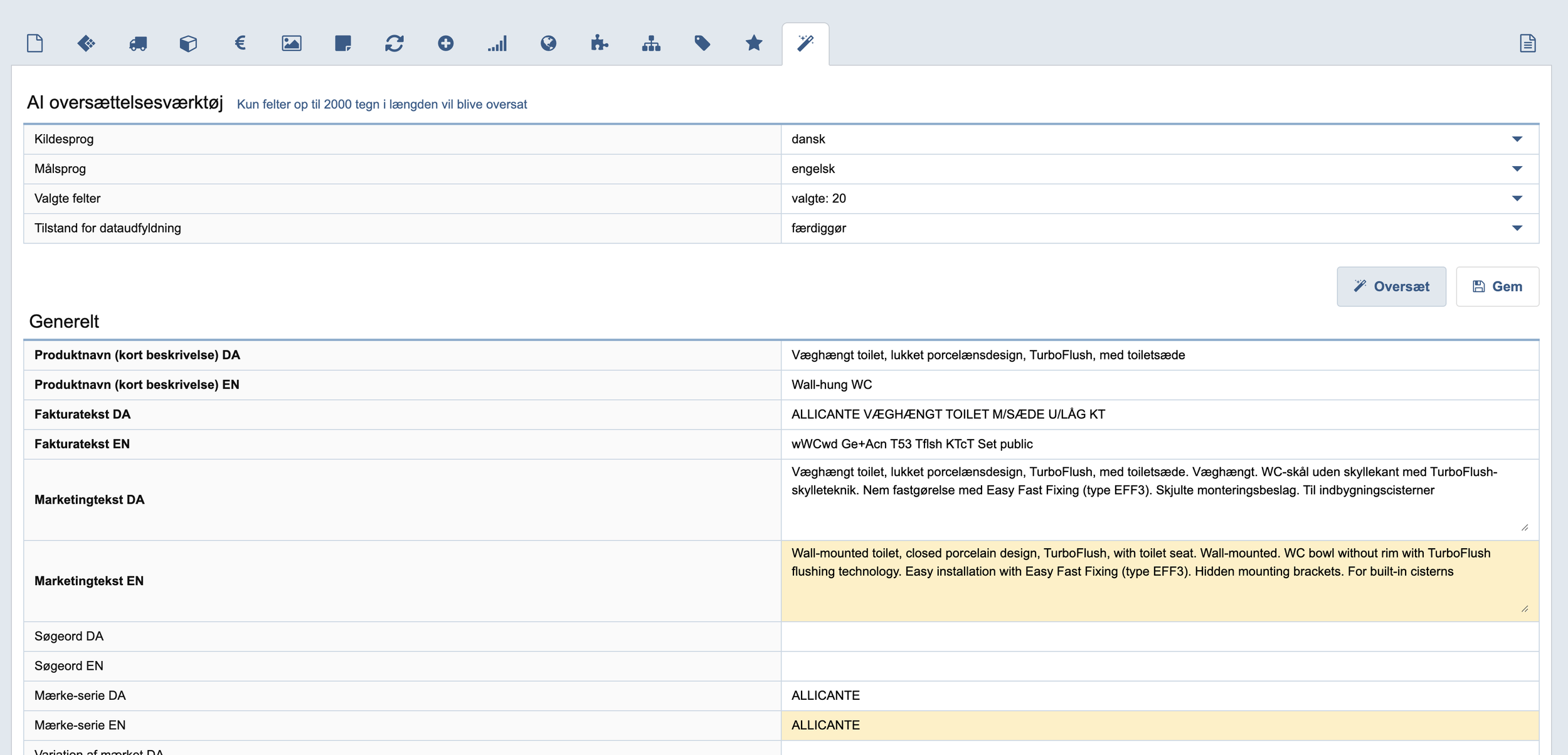 Når du er klar, klikker du på Oversæt, og AI-værktøjet oversætter felterne. De påvirkede felter vil være markeret med gult.