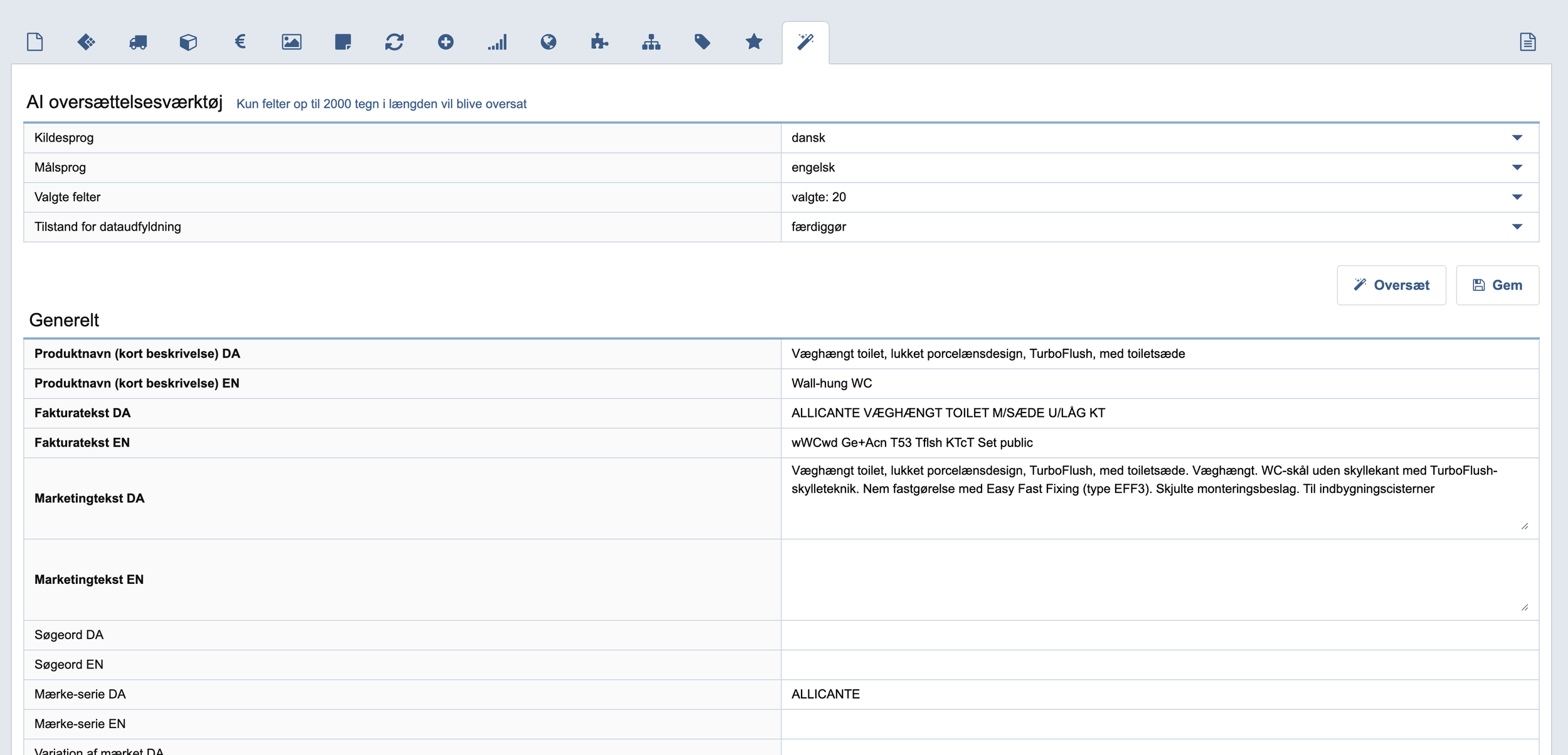 Oversættelsesværktøjet er tilgængelig og håndteres på produktniveau. Når du åbner et produkt til redigering, finder du en dedikeret fane til oversættelser.