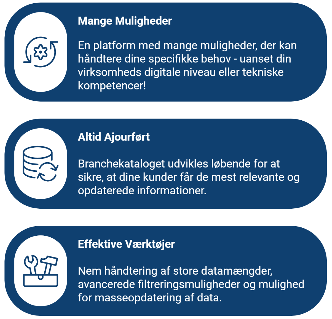 Uanset om din virksomhed mangler egne systemer, allerede er digitalt førende eller blot ønsker at styrke eksisterende løsninger, tilbyder Branchekatalogets PIM en fleksibel og professionel platform til håndtering af produktdata. Du får adgang til avancerede værktøjer, API-integration og miljødatabaser, der gør det nemt at optimere og levere kvalitetsdata – helt uden investering i dyr software.