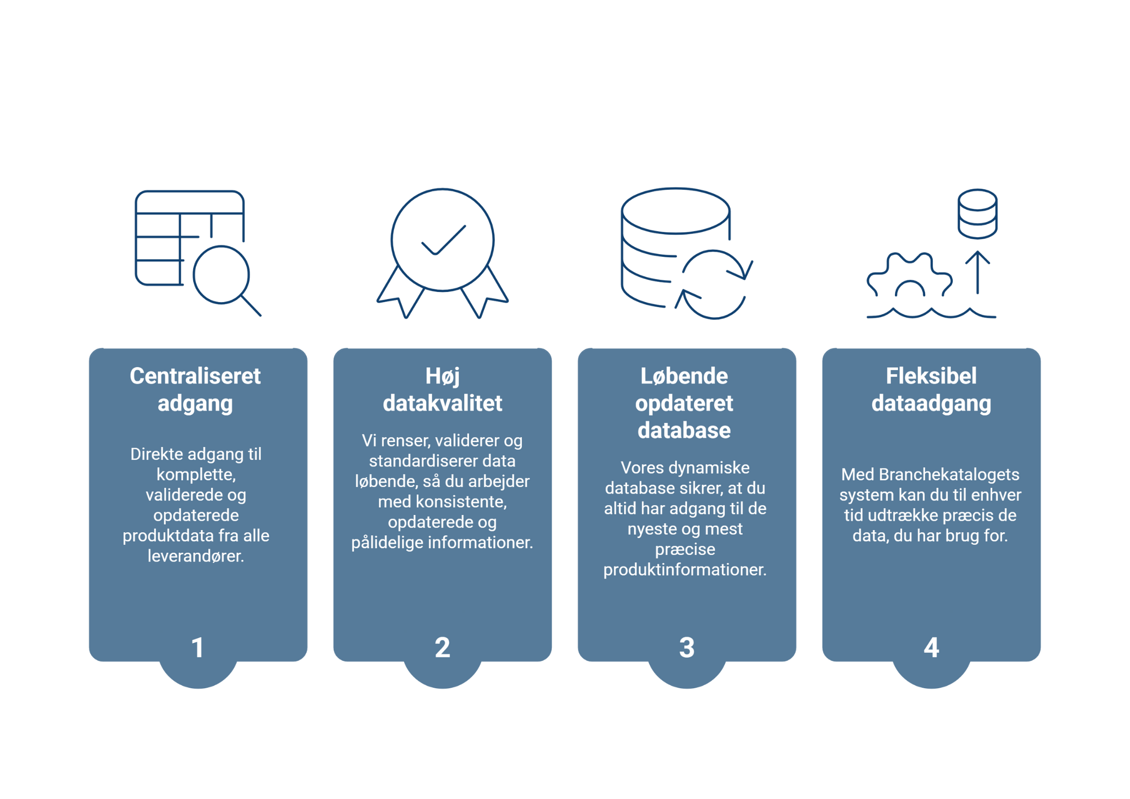 Ved at agere som det centrale datamidtpunkt og distribueringssystem sparer vi dig for unødvendige, særskilte dataleverancer, og du kan i stedet bruge din dyrebare tid på andre ting. Lad leverandørerne indsamle deres produktdata gennem Branchekataloget, mens du trygt, nemt og hurtigt henter den i dit eget format.